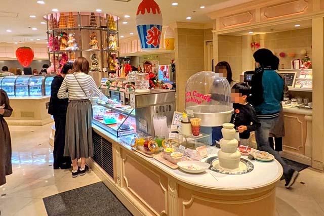 写真の手前側にもゼリーやら何やらの冷蔵ショーケースがあって、さらに手前にはチョコフォンデュンデュ、あとは綿あめを作る機械もあります。