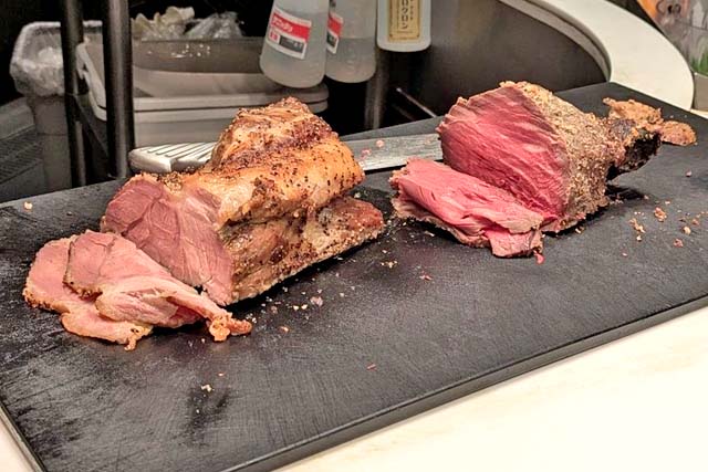 ディナータイムはローストビーフとローストポークも食べ放題メニューに加わるということで期待たっぷりの僕ら・・・。